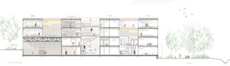 Das kompakte Gebäude nimmt die Fluchten des angrenzenden Mobility Hubs auf und bildet im Osten einen städtebaulichen Abschluss. Es orientiert sich an der Wohnbebauung im Norden und Osten und definiert einen klaren urbanen Straßenraum. Der zentrale Quartiersdurchgang als Korridor von Nord nach Süd führt über die großzügige Freifläche, in der Schulhof und Kita-Außenbereich eingebettet sind. Die Terrassierung des Baukörpers schafft eine kindgerechte Maßstäblichkeit und eine offene, lichtdurchflutete Umgebung, die sich nahtlos in das südlich gelegene „grüne Band“ einfügt. Ein vertikales Element an der östlichen Brandwand des Mobility Hubs ergänzt das Ensemble. Dieses begrünte Rankgerüst dient gleichzeitig als Sichtschutz, Kletterlandschaft und Träger für Solarpaneele und Regenwasserspeicherung.